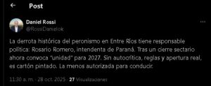 “La derrota histórica del peronismo en Entre Ríos tiene responsable política: Rosario Romero, intendenta de Paraná. Tras un cierre sectario ahora convoca “unidad” para 2027. Sin autocrítica, reglas y apertura real, es cartón pintado. La menos autorizada para conducir” posteó rossi en X.